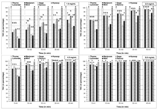 - Man, A.; Santacroce, L.; Jacob, R.; Mare, A.; Man, L. Antimicrobial Activity of Six Essential Oils Against a Group of Human Pathogens: A Comparative Study. Pathogens 2019, 8, 15. [Google Scholar] [CrossRef] [Green Version]