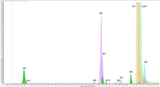 Overlapped extracted ion chromatograms (EIC) of dapoxetine (DAP) and its metabolites (M1–M11) after a 30-min incubation with HLM.