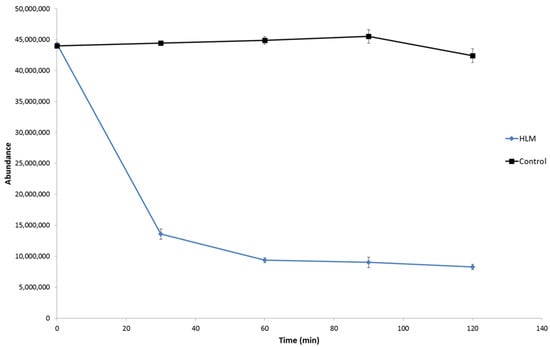 Biotransformation of dapoxetine in HLM (presented as the function of time; error bars represent the standard deviation of the mean, n = 3).