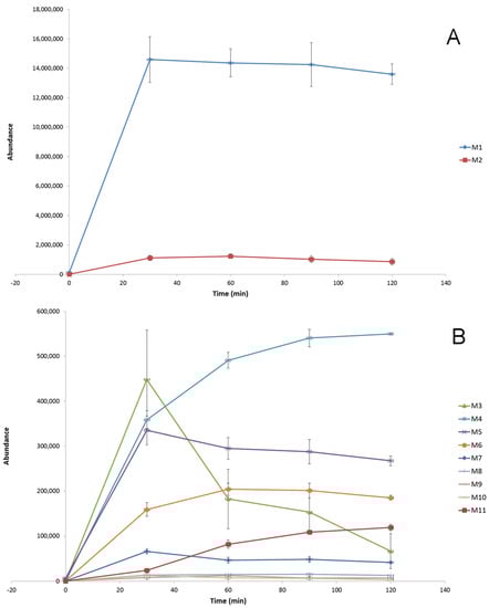 Evolution profiles of the dapoxetine metabolites (A,B) formed in HLM (presented as the function of time; error bars represent the standard deviation of the mean, n = 3).