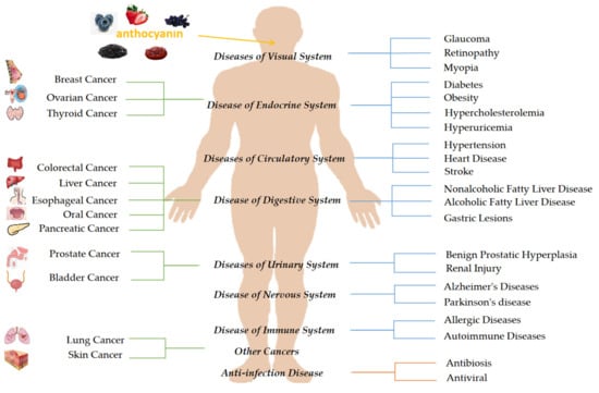 The structure and characteristics of natural products have evolved due to changes in the natural climate over millions of years, and natural products can promote health by their protective action against disease. Natural products can often be used as alternatives for treating emerging conditions [9,10]. Due to the side effects of drugs and people’s positive attitudes towards natural foods, natural products are more accepted by people to prevent and treat diseases. Anthocyanins are widely found in fruits and vegetables and can be easily found in daily life. In the past 20 years, research has revealed that anthocyanins are nontoxic natural pigments that have antioxidant and anti-inflammatory effects. Anthocyanins also possess antimicrobial, antiviral, antiallergic, anticarcinogenic, anti-inflammatory, antimutagenic, and antiproliferative effects, and thus, may play an essential role in preventing various degenerative diseases. Research data have shown that the consumption of anthocyanin-rich foods may reduce the incidence of circulatory, nervous, endocrine, digestive, sensory, urinary, and immune system diseases and cancer. We have summarized the effects of anthocyanins from different plants on various conditions to provide a reference for anthocyanins as natural medicines for the treatment and prevention of diseases (Figure 1).