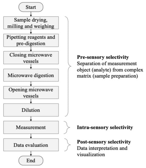 Compound-oriented measurements such as the determination of heavy metals in human tissue follow the concept of pre-, intra- and post-sensory selectivity [26]. The pre-sensory selectivity will be reached by the separation of the desired elements from the complex tissue matrix. This includes sampling, drying, homogenizing by milling, weighing, transfer in solution by digestion and a final dilution. The desired analytes are separated from the complex matrix prior the sensor system. The intra-sensory selectivity can be reached by a suitable single-sensor or a complex sensor system. In this study, heavy metals were determined in human tissues using ICP-MS, whereby the metal ions are separated according to their mass–charge ratio (m/z). The final step is to achieve the post-sensory selectivity by evaluation, interpretation, and visualization of the data delivered by the mass spectrometer. Figure 1 gives an overview of the general steps in the entire measurement process for the determination of heavy metals in human tissues.