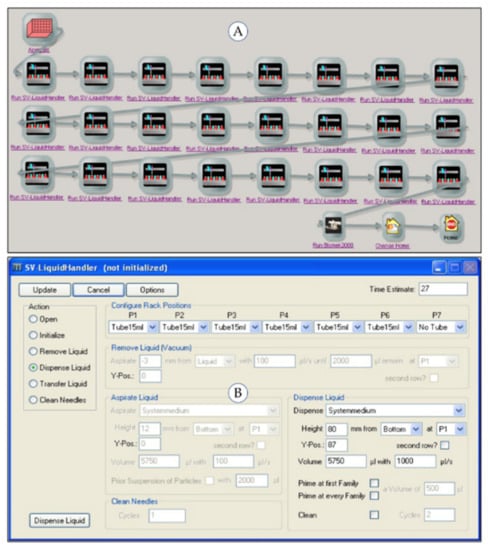 Automated subprocess “Dispensing Water”: (A) SAMI Editor with process flow, (B) inhouse software of single-vial liquid handler with dispensing parameters.