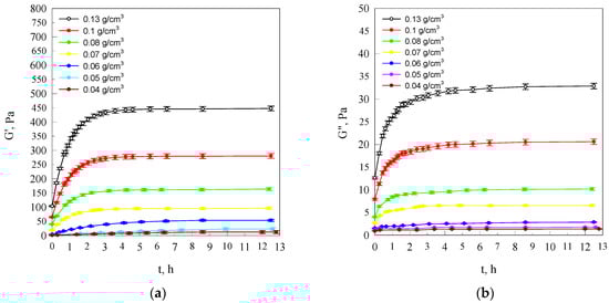 Kinetics of storage modulus (G′) (a) and of the loss modulus (G″) (b) in the process of formation of starch gels at different concentrations of starch in systems. The values are expressed as means ± SD (n = 3).