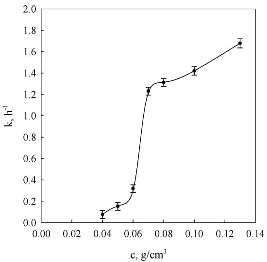 A very similar course of k(c) constant relationship was obtained as a result of the relaxation of velocity measurements of identical wheat starch gels, using for this purpose the NMR technique [37,38] in a range of concentrations exceeding 0.06 g/cm3. This indicates a close correlation of spatial structuring with local association processes.