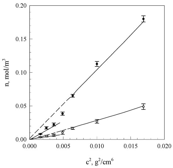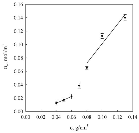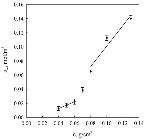 Figure 3 presents courses of segment equilibrium concentrations n∞ in the polymer concentration function in the solution calculated on the basis of Equation (2) as well as curves obtained in the result of additional fitting of these courses to Equation (7).