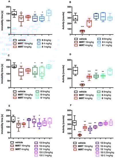 The effect of the tested compounds 6, 8 and 13 and mirtazapine on the immobility of mice in FST (A,C,E) and on locomotor activity (B,D,F). All compounds or vehicle were administered 30 min (ip) before the test. MIRT—mirtazapine. The results are presented as box plots showing the following data: mean (‘+’), median (horizontal line), upper and lower quartile (the width of the box shows interquartile range), upper and lower extreme (whiskers). Statistical analysis: Shapiro–Wilk test for normality and one-way ANOVA (Dunnett post hoc) * p < 0.05, ** p < 0.01, *** p < 0.001 vs. control group (vehicle); n= 6–8 mice per group.