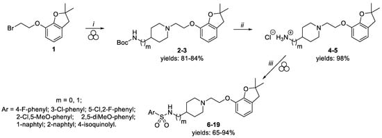 In the last decade, mechanochemistry, and in particular medicinal mechanochemistry [22,23], has been recognized as an innovative technique for the generation of various organic compounds as well as producing pharmaceutically relevant fragments and functionalities [24,25,26]. Taking into account the benefits of employing a solid-state approach over classic in-batch procedures (i.e., increased reaction yield, reduction of time, decreased use of organic solvents) [27,28], we developed a mechanochemical approach for the synthesis of the designed derivatives 6–19 (Scheme 1). Initially, alkylation of Boc-protected 4-aminopiperidine with the commercially available 7-(2-bromoethoxy)-2,2-dimethyl-2,3-dihydrobenzofuran 1 was carried out in a 10 mL PTFE jar with a 1.5 cm diameter stainless steel ball using a Retsch vibratory ball mill (vbm) operating at 30 Hz. The use of a slight excess of amine, K2CO3 as base, in the presence of KI, allowed us to achieve high conversion rates for intermediate 2 after a milling time of 140 min (for more details see Table S1). Further scale-up optimization was required to translate reaction conditions to a 35 mL PTFE jar (see Table S1). Increasing the loading of base (from 2 to 3 eq) together with elongation of reaction time (from 140 to 210 min) enabled us to reach a 97% conversion of substrates. After an acidic extraction at pH 3.5 to remove unreacted Boc-protected alicyclic amine, intermediate 2 was isolated with a high 95% purity and 84% yield. Having identified the optimal reaction conditions, the same mechanochemical protocol was applied for the alkylation of Boc protected 4-aminomethylpiperidine to obtain intermediate 3 (96% purity) in a satisfactory yield (81%) (see Table S2). In the next step, primary amine derivatives 4 and 5, obtained upon treatment of Boc-derivative 2 and 3 with gaseous HCl [29,30], reacted in a ball mill with different substituted arylsulfonyl chlorides to generate the designed sulfonamide derivatives.
