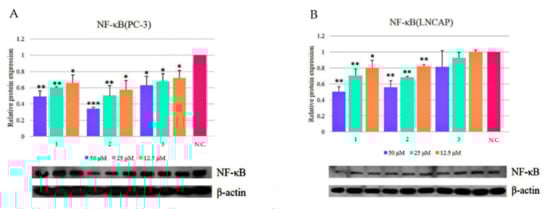 Nuclear factor kappa-light-chain enhancer of activated B cells (NF-κB) is a well-known negative regulatory factor of apoptosis, which controls DNA transcription, cytokine production, and cell survival. Dysregulation of NF-κB has been associated with inflammation, immune disease, and cancer [28,29,30,31,32]. In particular, the activation of NF-κB signaling correlates with PCa progression in PCa cell lines and has been associated with more advanced stages, chemoresistance, and metastatic spread [33,34,35,36].