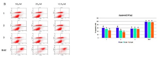 Apoptosis-inducing activities of various concentrations of oregonin (1), hirsutenone (2), and hirsutanonol (3) in PCa cell line. (A): PC-3 cells; (B): LNCaP cell. The results are expressed as mean ± SD of triplicate experiments (n = 3). BAY: positive control. Letters a–o in the same column indicate significant differences, p < 0.05.