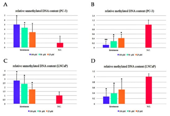 DNA methylation activity of hirsutenone (2) in PCa cell lines. (A,C): relative unmethylated DNA contents in PC-3 and LNCaP cell lines; (B,D): relative methylated DNA contents in PC-3 and LNCaP cell lines. The results were expressed as the mean ± SD of triplicate experiments (n = 3). NC: Normal control group. *: p < 0.05, **: p < 0.01, compared with the normal control group.