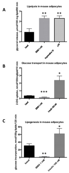 IBMX short-term effects on triacylglycerol breakdown and storage in rat adipocytes. Rat adipocytes were incubated without (basal, dark columns) or with 1 mM IBMX (grey columns) in the same conditions as the positive control (hatched or shaded columns), consisting of 10 µM isoprenaline for lipolysis (A), or 100 nM insulin for hexose uptake assay (B) and for determination of lipogenesis (C). The incubation period for IBMX or positive control with adipocytes was 120 min (A,C) or 45 + 10 min (B). Each column is mean ± SEM of 7 (lipolysis), 5 (glucose uptake), or 6 (lipogenesis) different determinations. Difference from respective basal at: * p < 0.05, ** p < 0.01, *** p < 0.001 by one-way ANOVA followed by Dunnett multiple comparisons.