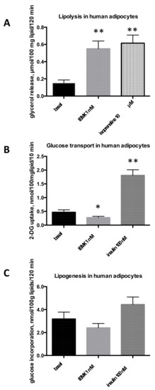 IBMX effects on triacylglycerol breakdown and storage in human adipocytes. Human adipocytes were isolated from subcutaneous adipose tissue obtained from a total of 18 adults undergoing abdominal dermolipectomy (mean age: 43; BMI = 26.0 ± 0.9) and tested for their lipolytic (A), glucose transport (B), or lipogenic (C) activities. As with rodent fat cells, basal levels were determined without any addition, while positive controls were: 10 µM isoprenaline for lipolysis or 100 nM bovine insulin for hexose uptake and lipogenesis. Each column is the mean ± SEM from six individuals. Significantly different from respective basal at: * p < 0.05, ** p < 0.01.