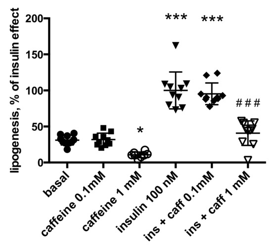 Caffeine inhibits basal and insulin-stimulated lipogenesis in mouse adipocytes. Data expressed as percent of maximal lipogenic response to insulin. The 100% indicates the mean glucose incorporation into lipids stimulated by insulin 100 nM found in ten different preparations of mouse adipocytes. Each condition was successfully tested in 10 adipocyte preparations, save for caffeine 1 mM alone (open circles), for which n = 8. Significance was determined compared to basal lipogenic activity (control, black circles) at: * p < 0.05, *** p< 0.001. Significant difference from insulin without caffeine (ins, inverted triangles) at: ### p < 0.001).