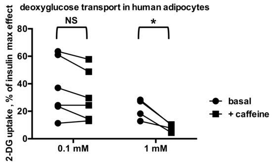 In keeping with the capacity of caffeine to impair the insulin activation of glucose metabolism by adipocytes, our attempt to extrapolate to humans was limited by the small sample size of subjects. We obtained less significant results in humans than in rodents. This limitation was likely due to a higher inter-individual variability of insulin sensitivity in humans than in animal models (compare Figure 4 and Figure 5). The present work, nevertheless, confirmed that caffeine prevents insulin-dependent glucose uptake in murine adipocytes as claimed in [11,12,13]. We demonstrated that this property also applies for human mature fat cells, but we could not clearly demonstrate that caffeine is antilipogenic in humans. Nevertheless, the effects of caffeine or IBMX observed in rodent fat cells are undoubtedly representative of those occurring in Man. The preclinical aspect of our work needs to be reinforced by more extensive studies with larger cohorts. It is required to determine whether a daily intake of caffeine below the safe limit of 400 mg per consumer [2,44] can really affect adipocytes in the manner proposed. Such future clinical studies should also characterize sensitive populations to take into account inter-individual variability in insulin and caffeine responsiveness.