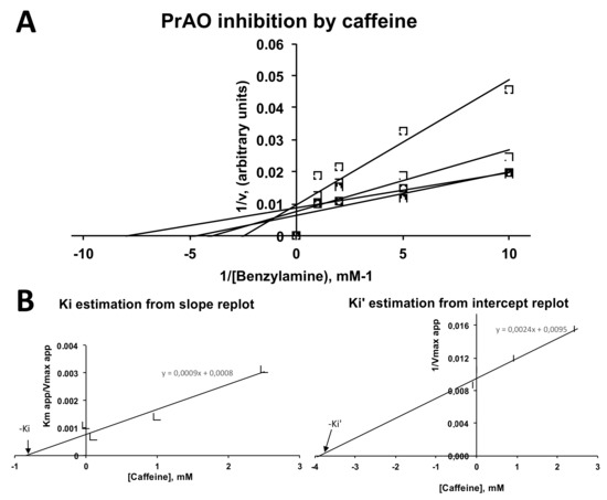 Human adipose tissue readily oxidized tyramine and benzylamine as recently reported [27]. The inhibition of human MAO by caffeine, already described for recombinant enzymes by Petzer et al. [24], was confirmed in human adipose tissue preparations: Ki was 0.33 mM and Ki’ was 1.8 mM (mixed inhibition; data not shown). Benzylamine oxidation by human adipose tissue preparations is totally abolished by semicarbazide inhibition as already reported [37], therefore due solely to SSAO/PrAO, and was impaired in the presence of caffeine (Figure 7). This was in agreement with previous observations of caffeine inhibition of human PrAO [27]. In the concentration range 0.1–2.5 mM, caffeine inhibited human PrAO with a broadly mixed pattern of inhibition. Ki estimation for the inhibition by caffeine was 0.88 mM while Ki’ was 3.95 mM, in close similarity to the parameters previously found with bovine soluble plasma amine oxidase [26].