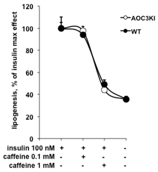 Caffeine impairs insulin-stimulated lipogenesis in mouse adipocytes irrespective of their SSAO/PrAO activity level. Insulin-stimulated lipogenesis was determined via the incorporation of [3H]-glucose into lipids of adipocytes freshly isolated from wild-type (WT, black circles) or SSAO/PrAO-invalidated mice (AOC3KI, open circles) measured after 120 min incubation with 100 nM insulin. Lipogenesis is expressed on the Y-axis as percentage of glucose incorporation into adipocyte lipids in response to 100 nM insulin. The X-axis displays the following conditions: insulin, insulin with caffeine at two concentrations, basal. Each point is the mean ± SEM of 8–14 mice. No significant effect of SSAO/PrAO invalidation was detected on the antilipogenic effect of caffeine, which, at 1 mM, was significant at p < 0.001 in both genotypes.