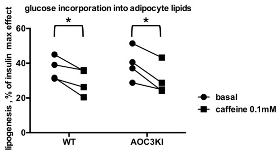 Caffeine inhibits basal lipogenesis in mouse adipocytes irrespective of their SSAO/PrAO activity level. Lipogenesis is expressed as percentage of maximal activity, with 100% corresponding to glucose incorporation into lipids in response to 100 nM insulin. Each couple of points corresponds to a preparation of adipocytes from wild type (WT) or transgenic (AOC3KI) mouse, incubated without (basal, circles) or with 0.1 mM caffeine (squares). Different from corresponding basal by paired t test at: * p < 0.05.