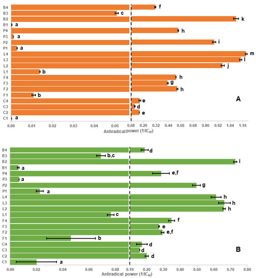 Antioxidant capacity of different genotypes of pulse seed coats measured by DPPH (A) and TBARS (B) assays. Letters on y-axis refer to different pulse crops; C: chickpea, F: faba bean, L: lentil, P: pea and B: common bean, whereas numbers refer to different seed coat colors. For example, L2 refers to black seed coats of Indianhead lentil (see Table 3, Section 3.1 for code). ARP: antiradical power; ARP is the reciprocal of IC50. Bars with different letters for each assay are significantly different (p < 0.05).