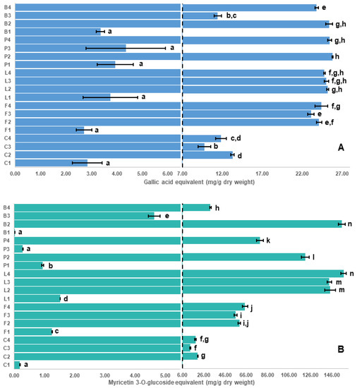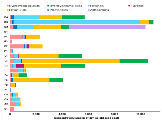Cumulative concentrations of major polyphenol subclasses in seed coat extracts in µmol/g dry weight using the targeted method. This figure was derived from Elessawy et al. [26] and the concentrations of individual polyphenols are given in Tables S4–S8. Letters on y-axis refer to different pulse crops; C: chickpea, F: faba bean, L: lentil, P: pea and B: common bean, whereas numbers refer to different seed coat colors. For example, L2 refers to black seed coats of Indianhead lentil (see Table 3 for code).