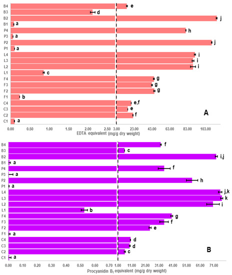 Iron chelation ability (A) and proanthocyanidin content (B) of different genotypes of pulse seed coats using Ferrozine and DMAC assays, respectively. Letters on y-axis refer to different pulse crops; C: chickpea, F: faba bean, L: lentil, P: pea and B: common bean, whereas numbers refer to different seed coat colors. For example, L2 refers to black seed coats of Indianhead lentil (see Table 3 for code). Bars with different letters for each assay are significantly different (p < 0.05).