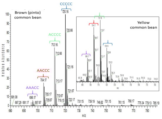 High resolution mass spectrometric (HRMS) full scan showing a procyanidin pentamer and different propelargonidin pentamers detected in yellow and brown common bean seed coats. Brackets with the same color have the same pentamer structure. C: (epi)catechin and A: (epi)afzelechin.