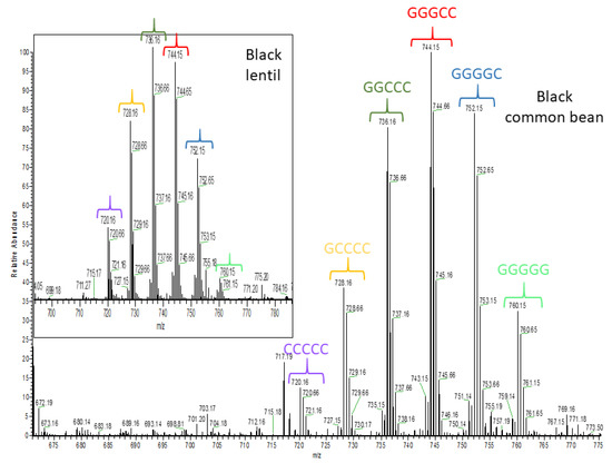 High resolution mass spectrometric (HRMS) full scan showing a procyanidin pentamer and different prodelphinidin pentamers detected in black common bean and lentil seed coats. Brackets with the same color have the same pentamer structure. C: (epi)catechin and G: (epi)gallocatechin.