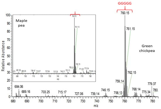 In addition to lentil and common bean seed coats in the heat map, maple (P2) and dun (P4) pea, showed a common cluster (Figure 5) mostly including amino acid derivatives [55] and prodelphinidins (estimated polyphenol amounts for pea are given in Table S11). Figure 8 shows the distribution of the doubly charged proanthocyanidin pentamers in maple pea (brown pea was similar). Unlike Figure 7 in which the prodelphinidins contained both (epi)gallocatechin and (epi)catechin (labelled “G-C”-prodelphinidins” in the Supplementary Tables), Figure 8 shows almost exclusively (epi)gallocatechin prodelphinidin pentamers (labelled “G”-prodelphinidins in the Supplementary Tables). The prodelphinidins contribute to the antioxidant potential [56,57] and the reason for the differences in antioxidant potential in P2 and P4 can be mostly attributed to their differences in proanthocyanidin concentration as was shown in Figure 3B.