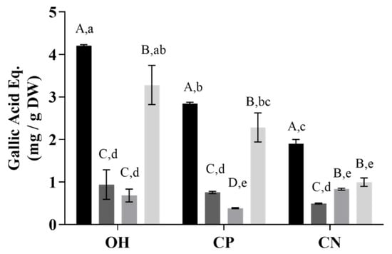 Total phenolic content of extracts performed with methanolic and aqueous solutions from grape wine-making by-products (gallic acid equivalent mg/g DW). OH—ohmic heating; CP—positive control; CN—negative control. Extraction solvents. ▪ MeOH with 1% HCl, ▪ H2O, ▪ lactic acid, ▪ citric acid. Different capital letters in the same extraction method indicate a statistically significant difference (p < 0.01). The small letters represent statistical differences between solvents and extraction methods (p < 0.05).