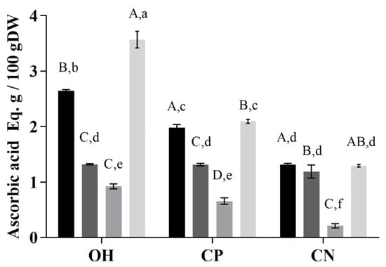 Antioxidant activity by ABTS test of extracts from grape by-products (g ascorbic acid equivalent/100 g DW). OH—ohmic heating; CP—positive control; CN—negative control. Extraction solvents. ▪ MeOH with 1% HCl, ▪ H2O, ▪ lactic acid, ▪ citric acid. Different capital letters in the same extraction method indicate a statistically significant difference (p < 0.01). The small letters represent statistical differences between solvents and the extraction method (p < 0.05).