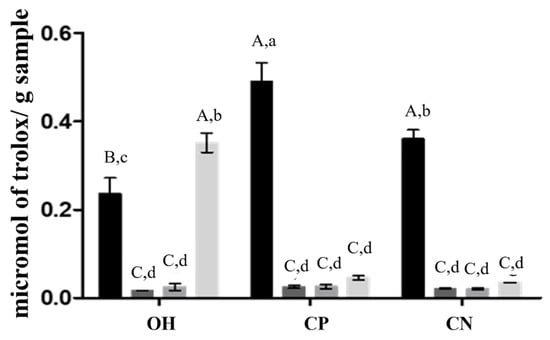 Antioxidant capacity by the ORAC method. Results are expressed in micromol of Trolox equivalent per gram of sample. OH—ohmic heating; CP—positive control; CN—negative control; extraction solvents. ▪ MeOH with 1% HCl, ▪ H2O, ▪ lactic acid, ▪ citric acid. Different capital letters in the same extraction method indicate a statistically significant difference (p < 0.01). The small letters represent statistical differences between solvents and the extraction method (p < 0.05).
