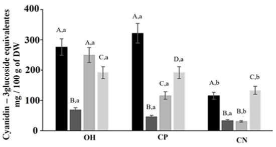 Results showed an increase of anthocyanin recovery (Figure 4) in OH samples when compared with the CN method for all solvents extraction (p < 0.05), while when compared with CP, similar results were obtained. This increase could be explained by non-thermal effects on plant cell permeabilization, which were probably due to electrical disturbances in the membranes of cells or by electroporation impacts [13,15,19]. However, it is essential to highlight that compared with CN, OH treatment resulted in a reduced thermal load. This may have contributed to less degradation of extracted anthocyanins and justify the presented results. Regarding individual compounds, the malvidin-3-O-glucoside is the main anthocyanin present for all extracts (Table 1 and Figure 5).