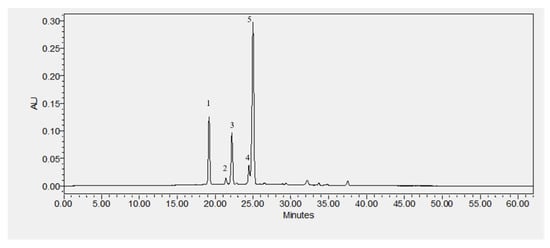 Chromatogram example of anthocyanins profile detected in samples by HPLC-DAD. (1) delphinidin-3-O-glucoside; (2) cyanidin-3-O-glucoside; (3) petunidin-3-O-glucoside; (4) peonidin-3-O-glucoside; and (5) malvidin-3-O-glucoside.