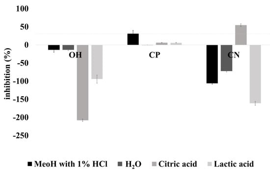 Cytotoxicity analysed by the XTT method. The line represents the non-toxic extracts. OH—ohmic heating; CP—positive control; CN—negative control. The extraction solvents. ▪ MeOH with 1% HCl, ▪ H2O, ▪ lactic acid, ▪ citric acid.