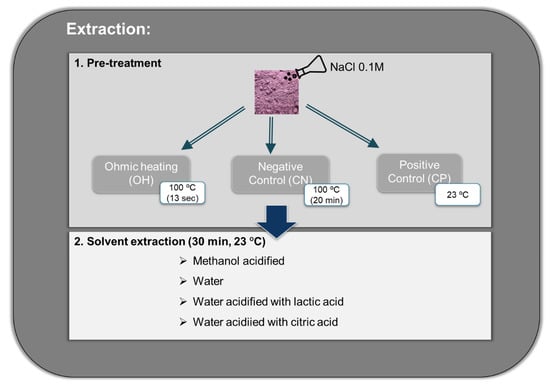 Water, acidified water (lactic and citric acid 1%), and methanol/water solution (80:19:1 v/v) acidified with hydrochloric acid usually are used as a conventional method (CONV) for anthocyanins extractions, as described by Silva et al. [8]. Both lactic and citric acid are food-grade acids usually used in the food industry.