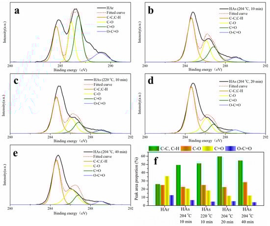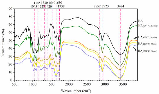 - The peak of about 1145 cm−1 represents aliphatic OH and asymmetric stretching of the C-O-C bridge, and the band around 1030–1080 cm−1 stands for C-O stretching of polysaccharides or polysaccharide-like substances [30,31]. The weaker adsorption intensity of these bands indicated that HAs had lower carbohydrate contents than HAr.