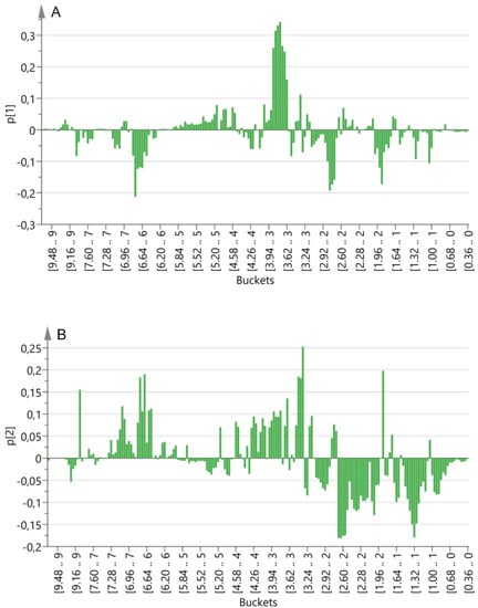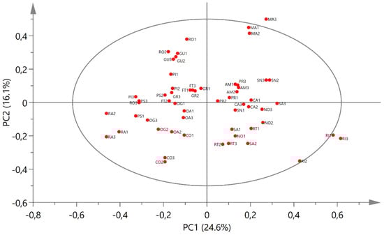 The PCA score plot (Figure 1) showed a distinction in two clusters according to PC1, i.e., a cluster described by the positive scores, and one characterized by the negative scores.