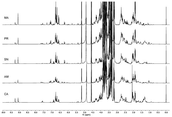 1H-NMR spectra of Group II: Cammarotana (CA); Oliva amara (AM), Sanginara (SN), Provenzale (PR), and Marinella (MA).