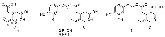 In the spectra of the Group III, aldehyde signals not yet identified were present, especially in Pizzulella (PI). However, since the same signals were also detected, along with other related ones, in the Pisciottana (PS) cultivar, 2D NMR analyses were carried out on the latter, allowing the identification of several metabolites at the same time. Signals resonating at δH 9.04 (doublet) and a double of doublets at δH 9.00 were detected and observed to always be at a 1:1 ratio. Based on the HSQC and HMBC data (Table 2), it was possible to identify the dialdehydic form of oleuropein, also known as oleomissional [21] (3, Figure 7). Finally, another aldehydic compound detected in the extracts was oleocanthal (4). Also in this case, their identity was confirmed thanks to 2D NMR data (Table 2), which were in accordance with those reported in the literature [22].
