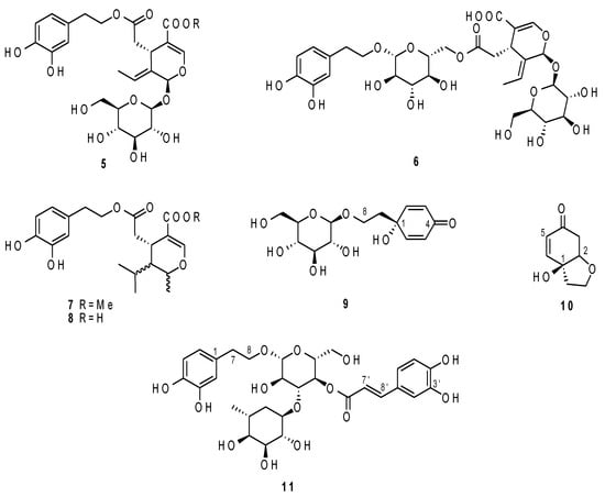 Besides the signals of the hydroxytyrosol and tyrosol secoiridoid derivatives, signals belonging to cornoside and to halleridone [24] (9 and 10, Figure 8) were also detected and identified based on the correlations observed in the Grossale cultivar (Table 2). Finally, the Racioppa extract allowed us to attribute signals belonging to verbascoside [20,25] (11, Table 2 and Figure 8).