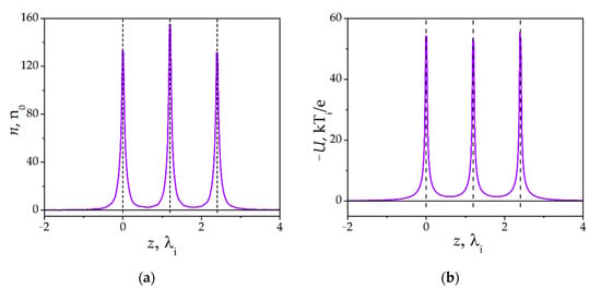 Figure 2 shows a cross section along the z-axis of the self-consistent spatial density distributions of the (a) space charge n(ρ = 0, z) and (b) plasma potential U(ρ = 0, z) in the vicinity of the dust particle chain. As already mentioned, the space charge n(ρ = 0, z) is expressed in units of n0. Far from the dust particle chain, ne/n0 ≈ ni/n0 ≈ 1. In the vicinity of the dust particles, the ion density ni increases by several orders of magnitude; in the same time, the electron density ne decreases. Thus, near a dust particle, the space charge is mainly determined by the ion density distribution (n(ρ, z) ≈ ni(ρ, z)). In the absence of an external electric field (E = 0), the space charge n(ρ = 0, z) is symmetric with respect to the chain’s center, i.e., the second dust particle. The ion cloud around the central dust particle is denser than for the first and the last dust particles. Furthermore, the ion clouds of the edge particles are anisotropic towards the central dust particle. This indicates that, when the dust particles are located close enough to each other, the ions orbiting around the first and third dust particles are partially recaptured by the central dust particle. It should be noted that, in this model, the condition of electric quasineutrality is met within the computational domain.