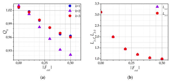 Figure 3 shows the dependences of the (a) self-consistent dust particles charges Qk (k = 1, 2, 3) and (b) equilibrium interparticle distances L1-2 and L2-3 between the dust particles in the chain on the external confining force value Fext. These dependences were calculated for li = 5 in the absence of an external electric field E = 0. Figure 3a shows that, with an increase of Fext, the dust particles charges Qk decrease. Furthermore, the charge of the central dust particle Q2 decays faster. As the Fext increases, the particles approach each other, and their ion clouds partially merge. Ions orbiting around the first and third dust particles are frequently captured by the central dust particle. Figure 2 shows that, indeed, a denser ion cloud is formed around the central dust particle. In the denser ion cloud, the collisions of ions with neutral atoms are more frequent. Due to more frequent collisions, the ion flux towards the surface of the central dust particle increases. As a result (see Equation (5) in Section 3), the charge Q2 decreases.