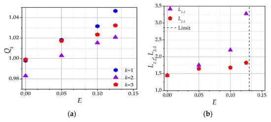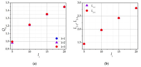 Figure 5b shows the dependence of L= L1-2 = L2-3 on li. An increase of li leads to a linear increase of L. Taking into account the increase of Qk, it can be stated that L increases due to the increase of the Coulomb repulsion forces. Furthermore, an increase L by itself also leads to an increase of Qk (see Figure 4). Thus, with a change of Fext or li, a positive feedback effect is observed between the Qk and L. An increase in li leads to an increase of the screening length and Coulomb forces; therefore, the chain is rearranged. This is consistent with the experimental results presented in reference [28], where it was shown that, at lower gas pressures, the interparticle distance increases. It is also worth noting that, for every chosen value of li, the dust particles are equidistant for E = 0.