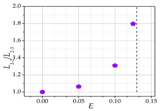 It should be noted that asymmetry arises in the interparticle distances under the influence of an external electric field, and L1-2 becomes larger than L2-3. Additionally, it is interesting that the ratio L1-2/L2-3 depends on E nonlinearly (see Figure 7). It can be observed that, with an increase of E, the ratio L1-2/L2-3 increases nonlinearly, i.e., the middle particle is closer to the third particle than to the first (L1-2 > L2-3). This is due to the fact that the force acting on the central dust particle from its ion cloud is significant. In the case of E = 0, the equidistance of the dust particles was a consequence of the Fq = 0. The equilibrium condition then changed and, with it, the equilibrium interparticle distances.