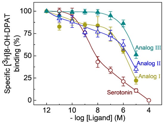 Competition binding of fluorescent NBD-labeled serotonin ligands to the human serotonin1A receptor stably expressed in CHO-K1 cells. Radioligand binding assays were carried out with [3H]8-OH-DPAT in the presence of a range of concentrations (from 10−12 to 10−4 M) for serotonin (○) and NBD-labeled analogs I (●), II (Δ) and III (▲). Values of specific binding measured in the presence of fluorescent analogs are expressed as a percentage of total binding obtained at the lowest concentration of the competing ligand. The curves represent nonlinear regression fits to the experimental as described in the Supplementary Material. Data shown are means ± SE from five independent experiments. Nonspecific binding was determined in the presence of 10−4 M unlabeled serotonin in each case. Ki values were determined according to Cheng and Prusoff [60] and the average values are listed in Table 1. See Materials and Methods for other details.