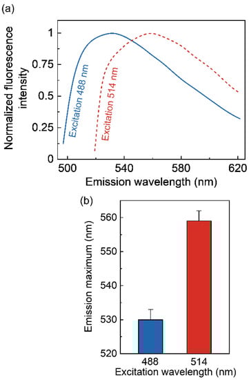 (a) Representative fluorescence emission spectra of NBD-serotonin analog I bound to the serotonin1A receptor expressed in CHO-K1 cells at different excitation wavelengths. The excitation wavelengths were 488 (—) and 514 (- - -) nm. All spectra are intensity-normalized at the emission maximum. The concentration of NBD-serotonin analog I was 7 μM. A Zeiss LSM 880 inverted spectral imaging confocal microscope with a multichannel spectral detector was used to construct pixel-by-pixel fluorescence emission spectra from the confocal images. (b) Effect of changing excitation wavelength on the wavelength of maximum emission for NBD-serotonin analog I. Data represent means ± SE of at least 35 different fields from three independent experiments. See Materials and Methods for other details.
