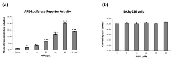 In our previous study, we isolated 189 minor compounds from Jing liqueur [13]. Most of the compounds were assayed on Nrf2–HepG2 stable cells using the luciferase system to identify Nrf2 activators at 40 μg/mL in triplicate [13]. Eighteen compounds were tested active, but they only activated Nrf2 moderately [13]. Further assay-guided separation of a crude extract led to the identification of MNG (3.1 μg/L = 7.7 nM; Figure 1; MS and 1H NMR: Figures S1 and S2) as a potent Nrf2 activator. Treatment of Nrf2–HepG2 stable cells with MNG resulted in a dose-dependent increase in ARE-dependent luciferase activity (Figure 2a). The induction of the reporter gene was enhanced about twofold at 5 μM and 20-fold at 80 μM in the luciferase system. Next, we investigated the cytotoxicity of MNG against the EA.hy926 cells with the MTT assay (Figure 2b). No cellular toxicity of MNG was observed at concentrations of up to 80 μM at 24 h. Therefore, in this study, MNG was tested at concentrations between 5 and 80 μM in the subsequent experiments.