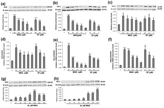 To investigate whether MNG could induce the expression of Nrf2-ARE transcriptional activity, we analyzed the effect of MNG on Nrf2 protein and mRNA expressions using Western blot and RT-qPCR, respectively. Similar to the luciferase activity, MNG upregulated the Nrf2 protein expression in a dose-dependent manner (Figure 3a). Since both HO-1 and NQO1 are typical downstream antioxidant enzymes mediated by Nrf2 [18], the effects of MNG on the protein and mRNA expression of HO-1 and NQO1 were also assessed. Results showed that MNG induced the HO-1 (Figure 3b,e) and NQO1 (Figure 3c,f) protein and mRNA expression in a dose-dependent manner. Similarly, expression of Nrf2, HO-1 and NQO1 was strongly induced by the positive control (SF). Western blot analysis was also performed to detect the expression of Nrf2/HO-1 protein as a function of time. The results demonstrated that the MNG treatment significantly increased HO-1 protein expression from 1 h to 24 h in a time-dependent manner (Figure 3h). On the other hand, the MNG treatment resulted in a time-dependent increase in Nrf2 protein expression from 2 h to 16 h. However, the Nrf2 protein expressions at 20 and 24 h treatment times were decreased (Figure 3g).