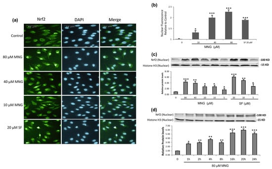 Effects of MNG on nuclear translocation of Nrf2 in EA.hy926 cells. (a) Representative images in EA.hy926 cells. Nuclei were stained by DAPI (blue) and transcription factors were stained by immunolabeled antibodies for Nrf2 (green). The fluorescent images were acquired by an Operetta high-content imaging system, using a 20× objective lens (Scale bar represents 50 µm). (b) Average relative nuclear fluorescence was quantified by the intensity of fluorescence from individual cells. (c) Cells were incubated with MNG and SF at the indicated concentrations for 24 h. The protein expression of Nrf2 in nuclear extracts was examined by Western blot. Histone H3 was used as loading control for nuclear extracts. (d) EA.hy926 cells were treated with 80 μM MNG for the indicated durations. The Nrf2 protein translocated into nuclei was analyzed by Western blot. The data in the figure represent the mean ± SEM of 3 independent experiments. * p < 0.05, ** p < 0.01 and *** p < 0.001 compared with the control group.