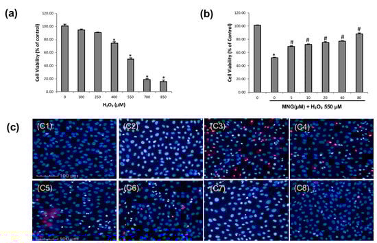 Protection of EA.hy 926 cells by MNG against H2O2-induced cell death. (a) Cells were treated with 550 µM H2O2 for 6 h. H2O2 caused a concentration-dependent reduction of cell viability in EA.hy926 cells. (b) Cells were pretreated with 0–80 µM MNG for 24 h, followed by incubation with or without 550 µM H2O2 for 6 h. Cytoprotection of MNG against H2O2 -induced injury in EA.hy926 cells showed a dose-dependent enhancement from 5 µM to 80 µM. Cell viability was determined by using the MTT assay. * p < 0.05 vs. control group, # p < 0.05 vs. 550 µM H2O2 group. Data are the means ± SEM of 3 independent experiments. (c) Cell death was determined by using Hoechst 33,342 and PI double fluorescent staining C1: control; C2: 80 µM MNG; C3: 550 µM H2O2; C4−C8: 5, 10, 20, 40, 80 µM MNG + 550 µM H2O2; scale bars represent 100 µm.